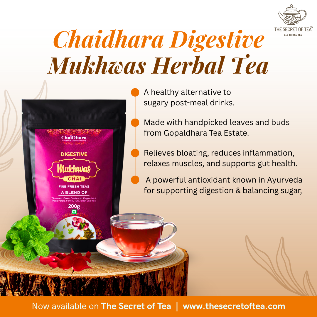 Sip your way to better digestion with Chaidhara Digestive Mukhwas Tea—a perfect blend of Ayurveda, tradition, and premium Darjeeling tea.