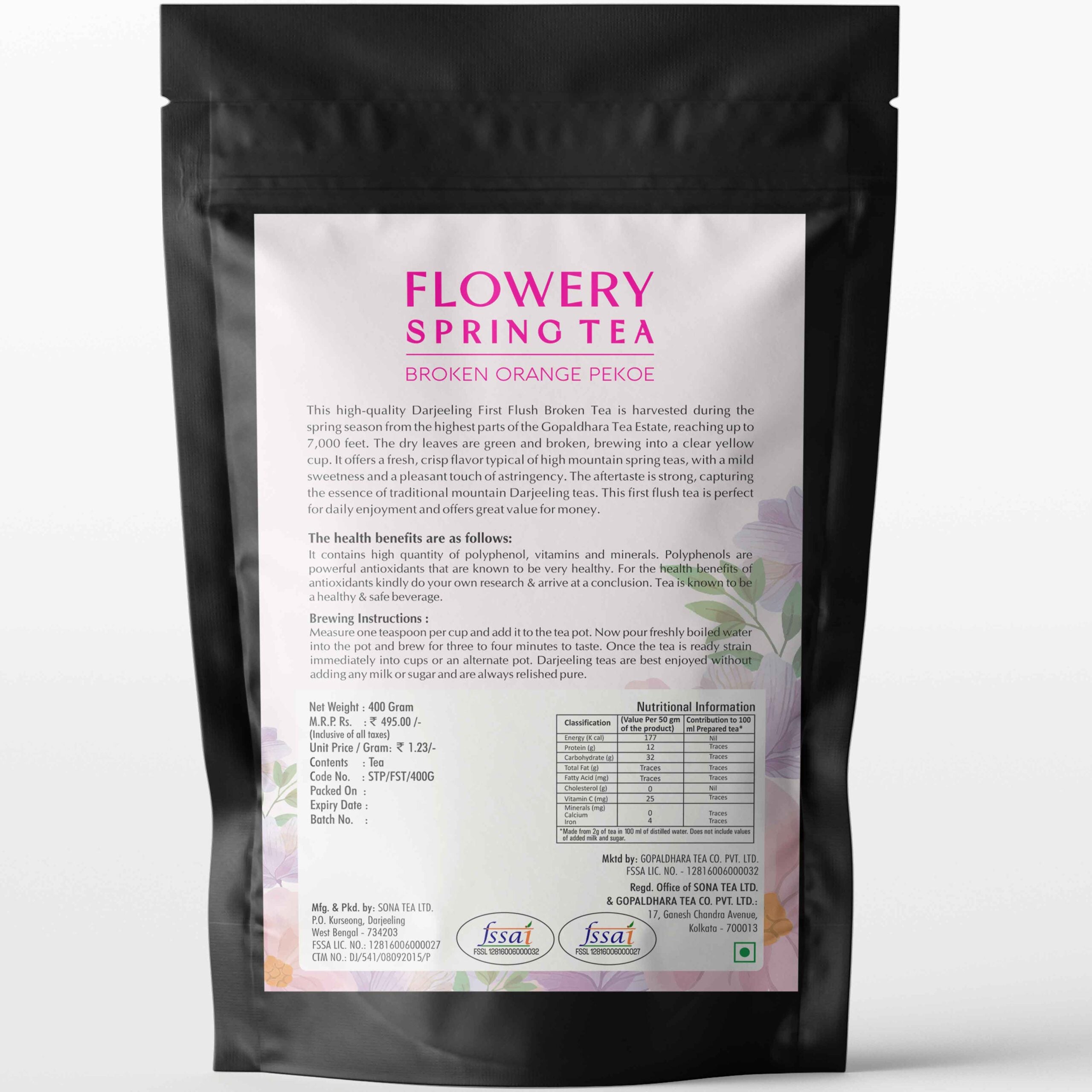 Fresh, crisp, and beautifully expressive — Gopaldhara Darjeeling First Flush Flowery Broken Orange Pekoe (BOP) Black Tea is harvested during the early spring season from the highest peaks of the Gopaldhara Tea Estate, rising up to 7,000 feet. The cool climate and slow growth at these elevations give this tea its distinctive first flush brightness.