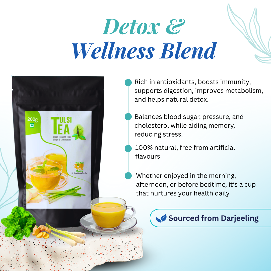 Start your wellness journey with our Detox Tulsi Green Tea, an invigorating blend of Green Tea, Holy Basil (Tulsi), Ginger, and Lemongrass. This fat-burn tea offers a balance of flavour and function, refreshing, soothing, and full of health benefits.