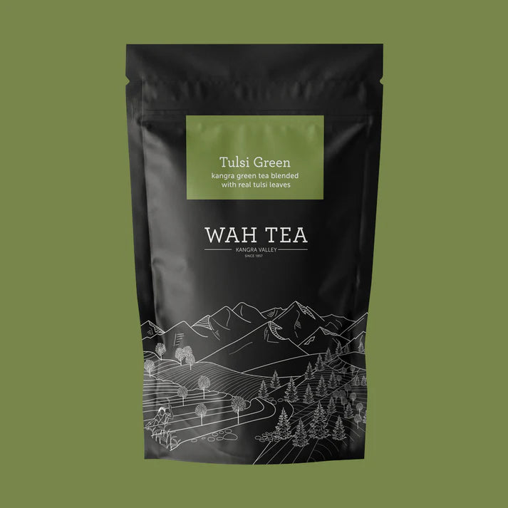 From the serene slopes of the Kangra Valley, where mountain air meets heritage craft, Wah Tea Tulsi Green Tea is born as a celebration of India’s timeless tea and wellness traditions. Each leaf is carefully handpicked and blended with sacred tulsi leaves — a herb revered for centuries for its healing power.