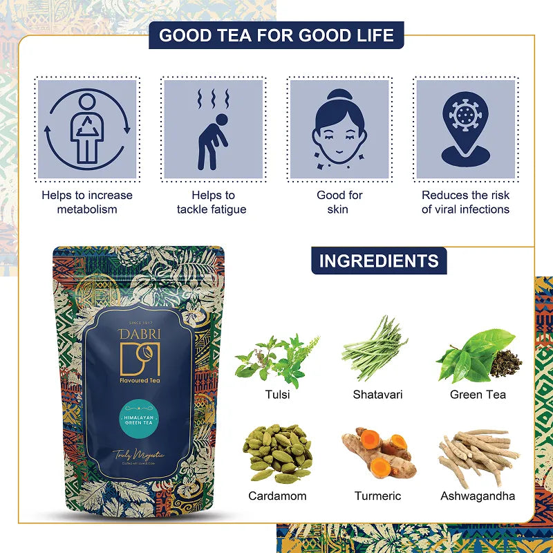 Dabri Himalayan Green Tea reflects this philosophy by combining green tea from Majherdabri Tea Estate with tulsi, turmeric, cardamom, ashwagandha and shatavari, bringing together estate-grown tea and traditional ingredients in a balanced blend.