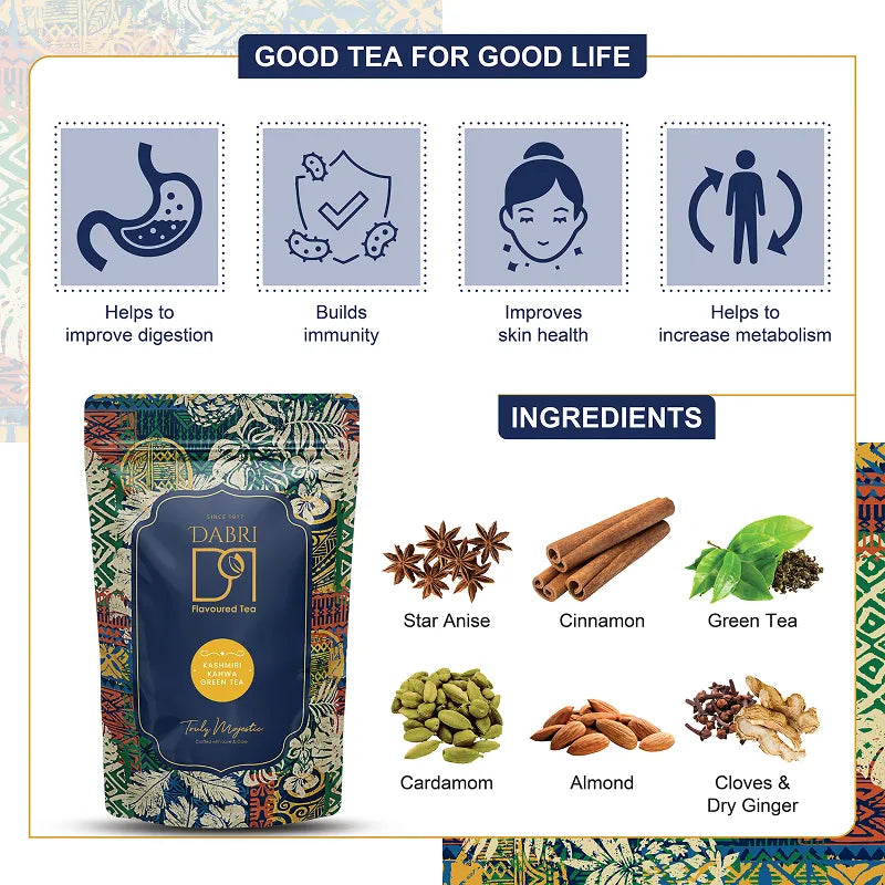 Dabri Kashmiri Kahwa Green Tea reflects this philosophy by pairing green tea from Majherdabri Tea Estate with traditional kahwa ingredients such as saffron, almonds and aromatic spices, bringing together estate-grown tea and the heritage of Kashmiri kahwa.