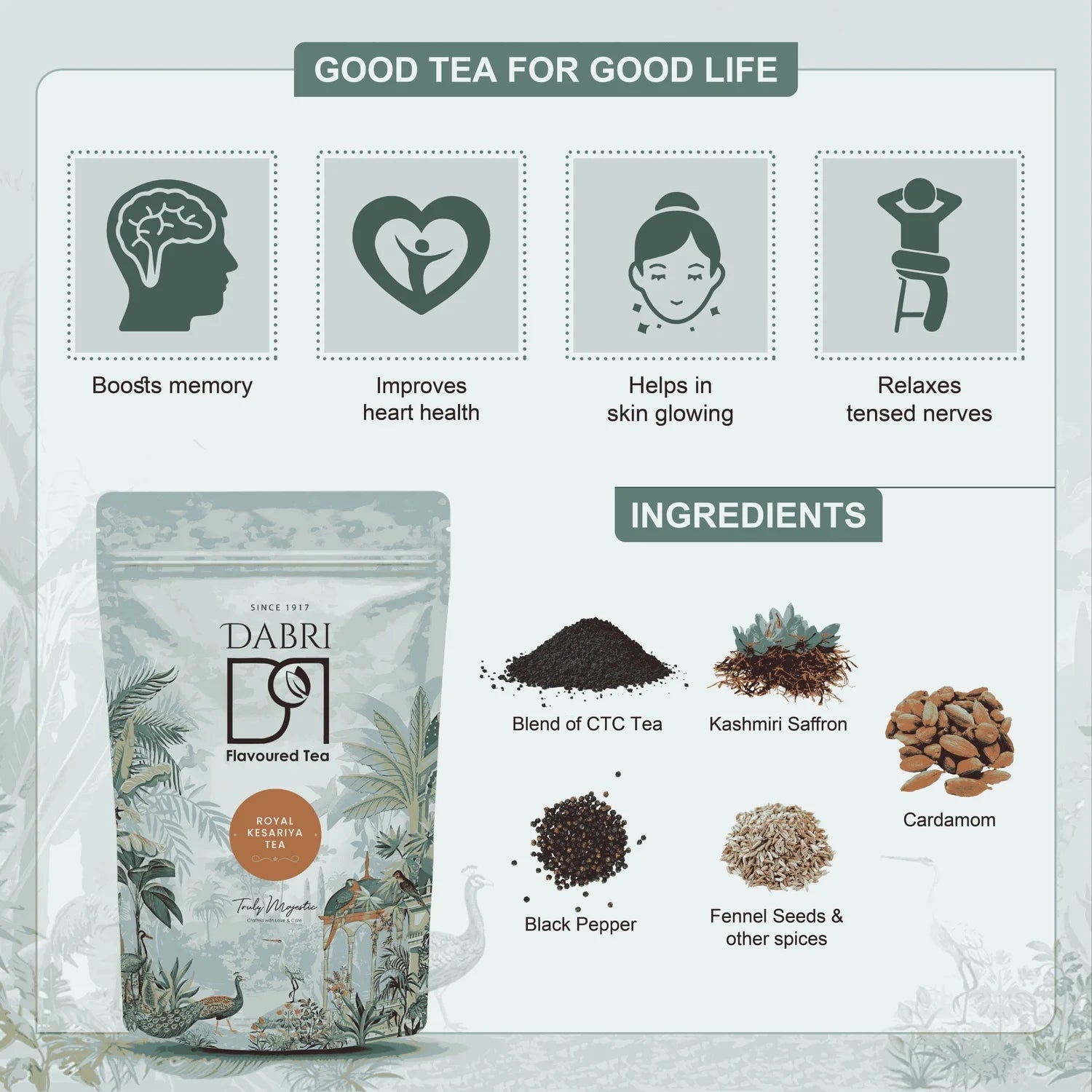 Dabri Royal Kesariya CTC Black Tea reflects this philosophy by combining robust CTC tea with the aroma of Kashmiri saffron and traditional spices, bringing together the strength of Indian chai and the craftsmanship associated with Dabri.