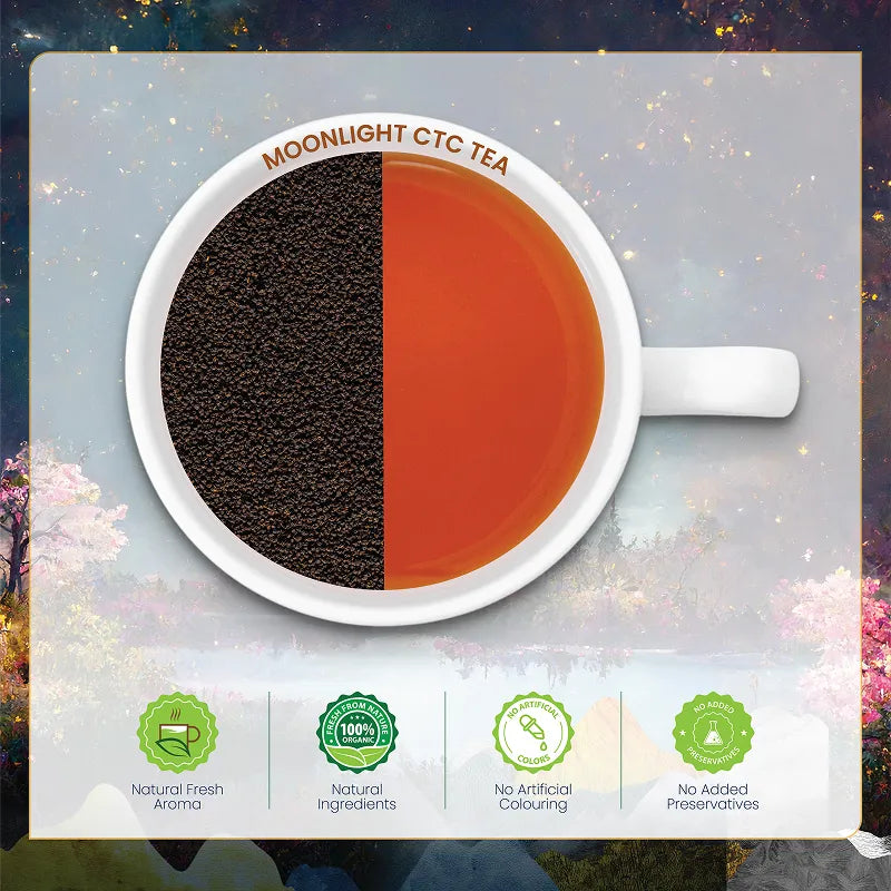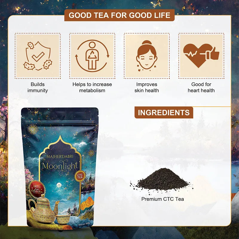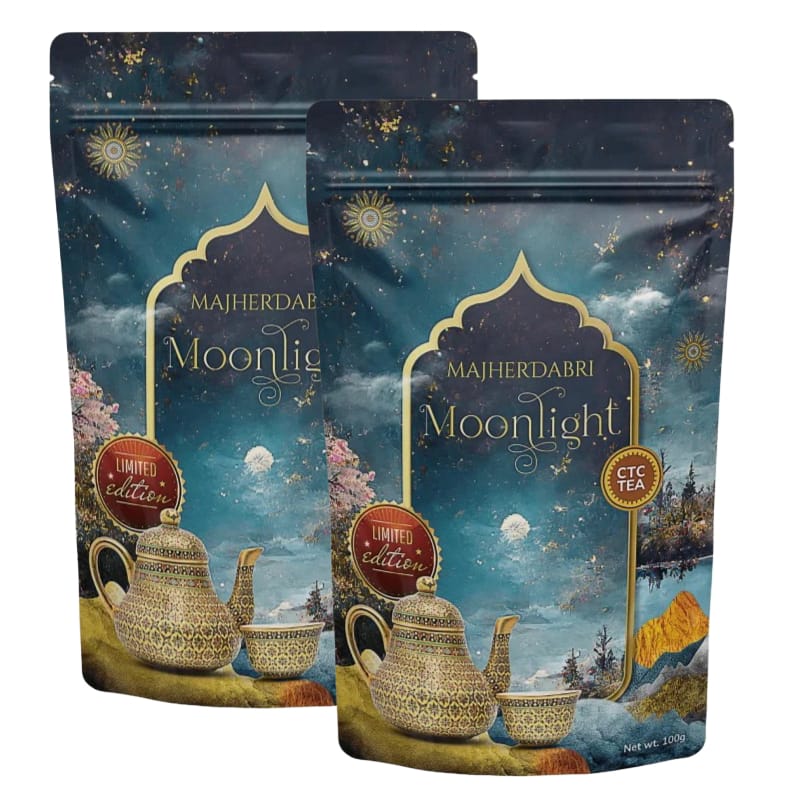 Majherdabri Moonlight Black Tea is crafted using a rare night-time harvesting method, where select tea leaves are handpicked under the glow of the full moon. The cooler night conditions allow the leaves to retain their natural smoothness and aromatic depth, resulting in a more balanced and nuanced cup. This distinctive approach sets it apart as a unique expression of CTC tea from the Dooars region.