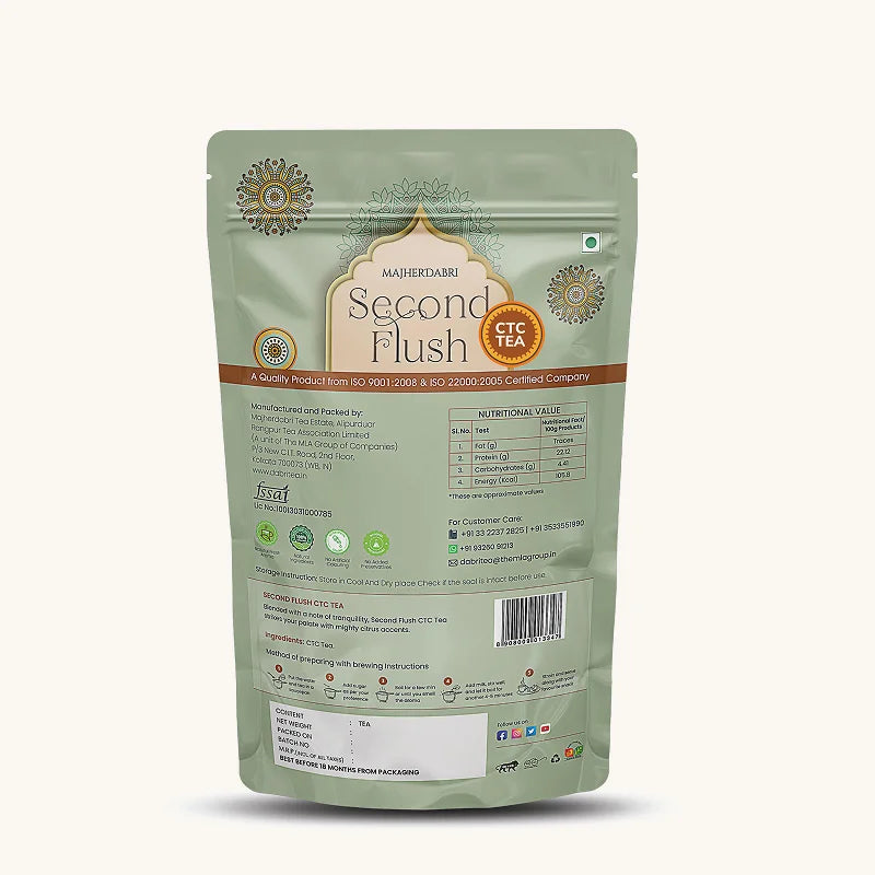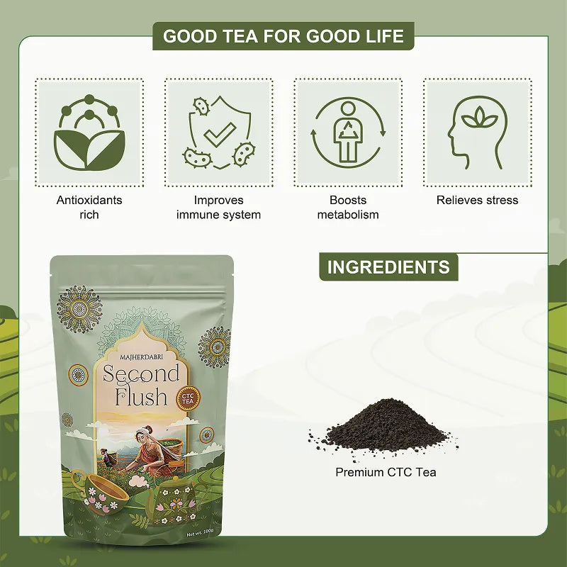 Majherdabri Second Flush Black Tea is crafted from premium CTC tea grown in the Dooars region of North Bengal. Harvested later in the season, this tea develops a fuller body with brighter, citrusy notes and a more rounded depth compared to first flush teas. Carefully processed, it delivers a bold and lively cup that pairs beautifully with milk and offers a satisfying everyday brew.