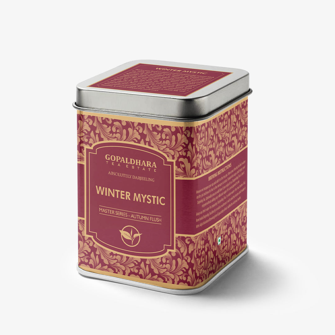 Gopaldhara Frosted Winter Mystic Autumn Flush Black Tea is a rare and extremely limited edition autumn black tea crafted from naturally frosted leaves harvested at the highest elevations of the Gopaldhara Tea Estate in Darjeeling. Plucked during the final autumn harvest from select AV2 clonal bushes growing between 5500 and 7000 feet, this tea develops under near-freezing conditions that slow growth and intensify flavour formation. The well-sorted dry leaves appear brownish-black and compact, brewing into a bright, transparent orange liquor with a coppery infusion. The cup reveals a fresh autumn Darjeeling aroma, a pronounced honeyed sweetness with a distinct Earl Grey–like finish, and fruity notes of honey, plum, and raisin. Smooth, mouth-filling, and non-astringent, the aftertaste is long-lasting and captivating, making this one of Gopaldhara’s rarest autumn expressions.