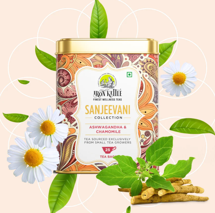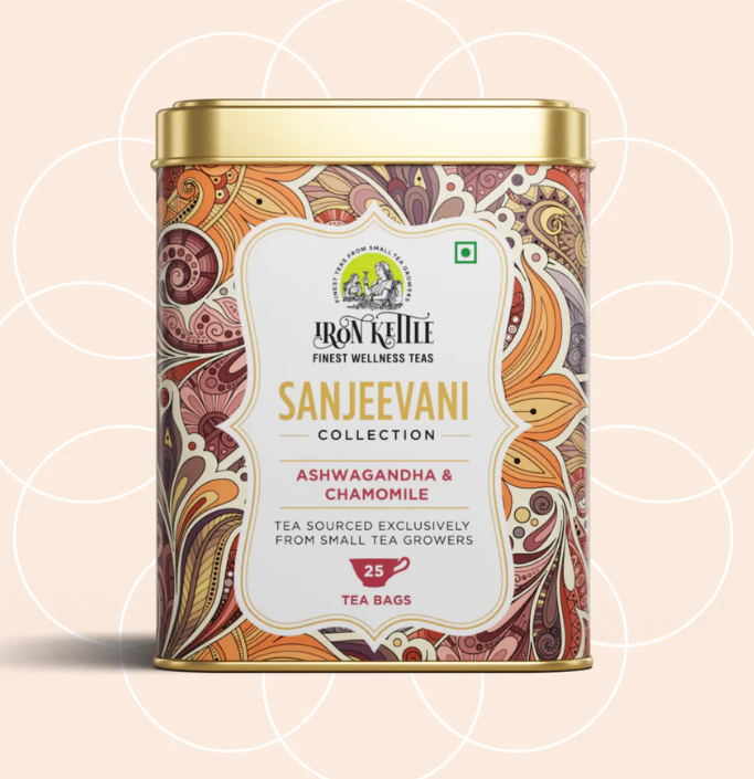 Iron Kettle Sanjeevani Ashwagandha and Chamomile blended with Green Tea is a carefully composed tea created to support moments associated with stress and sleep. This blend brings together green tea with Ashwagandha, Chamomile, Licorice, Spearmint and Lavender, combining tea character with botanicals traditionally used in calming blends.