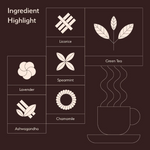 The light, vegetal profile of green tea provides a clean base, allowing chamomile and lavender to express soft floral notes. Ashwagandha adds depth, while licorice and spearmint contribute gentle sweetness and freshness. The cup remains smooth and composed, designed for unhurried moments later in the day.
