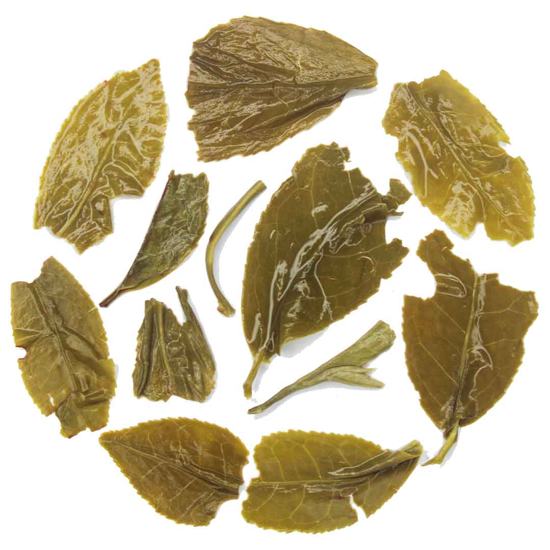 The dry leaves appear dark green with visible buds, and when brewed, they unfurl into a bright green liquor. The cup is rich and silky on the palate, offering vegetal and umami notes, hints of pine, a soft natural sweetness, and a clean, lingering finish with no astringency.