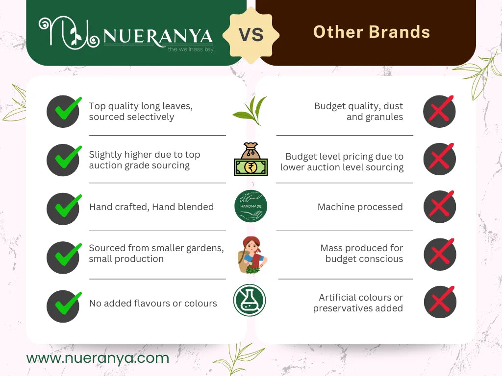 The brand is deeply committed to ethical and sustainable sourcing, supporting marginalised and small-time agro-growers through responsible partnerships. Nueranya’s products are created using natural and nature-derived ingredients, reflecting a transparent approach to tea making that values quality over shortcuts.