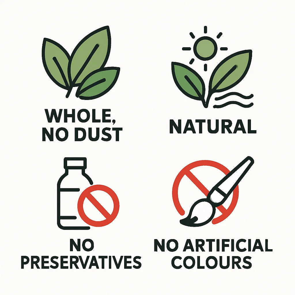 Whole leaf Assam green tea is high in antioxidants and catechins, known to support fat metabolism, heart health, and immunity.