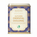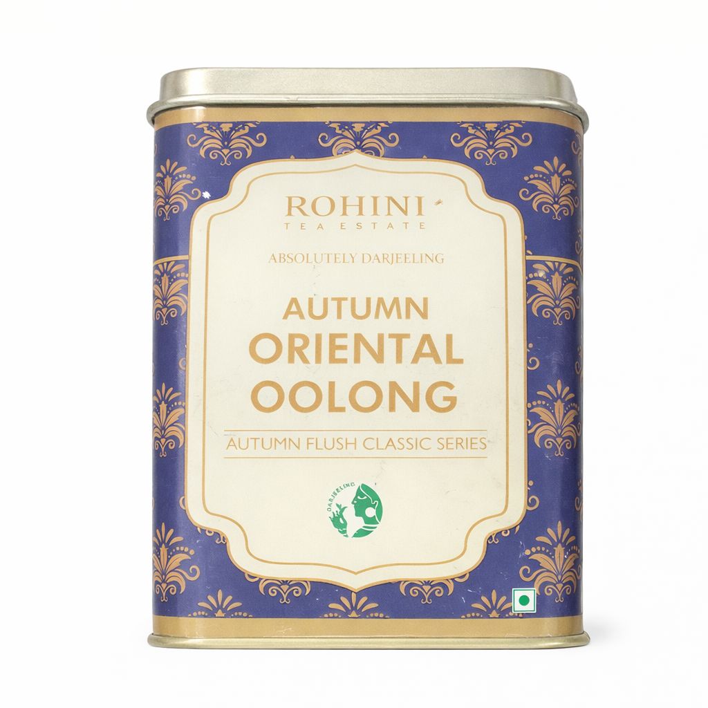 Rohini Autumn Flush Oriental Oolong is an exquisite winter-frosted oolong cultivated at the Rohini Tea Estate from premium-quality AV2 bushes grown between 3000 and 4400 feet. Harvested during the cool and mist-laden months of November and December, this tea develops under dry weather and frequent fog, which naturally slows leaf growth and intensifies flavour concentration. The narrow harvesting window enhances its rarity. The brownish leaves with abundant golden tips brew into a semi-transparent orange liquor with a greenish infusion. The cup reveals honeyed sweetness, a rounded muscatel finish, and layered notes of ripe fruits reminiscent of red wine. Smooth and non-astringent, it concludes with a long, pleasant, and lingering aftertaste.