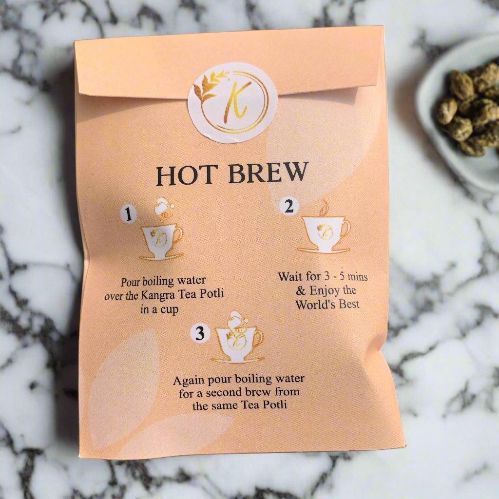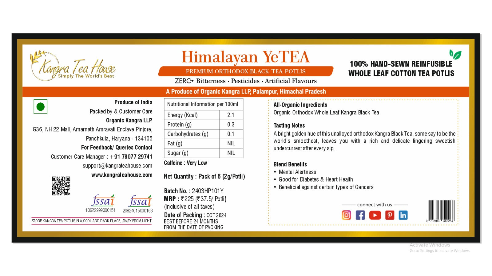 Kangra Tea House Himalayan YeTEA 100% Organic First Flush Orthodox Black Tea is a premium whole-leaf black tea sourced directly from the high-altitude estates of the Kangra Valley, thoughtfully packed in chemical-free cotton tea bags for a clean and natural brew.mIts leaves are organically grown, carefully plucked and orthodox-processed to deliver a bright golden liquor with a refreshing and delicate flavour. The brew carries subtle woody notes and a gentle hint of sweetness, coupled with a pleasant astringency that unfolds on the palate. Himalayan YeTEA is designed to offer pure Himalayan freshness, clarity and energy — a refined everyday tea for those who value quality, tradition and wellness.
