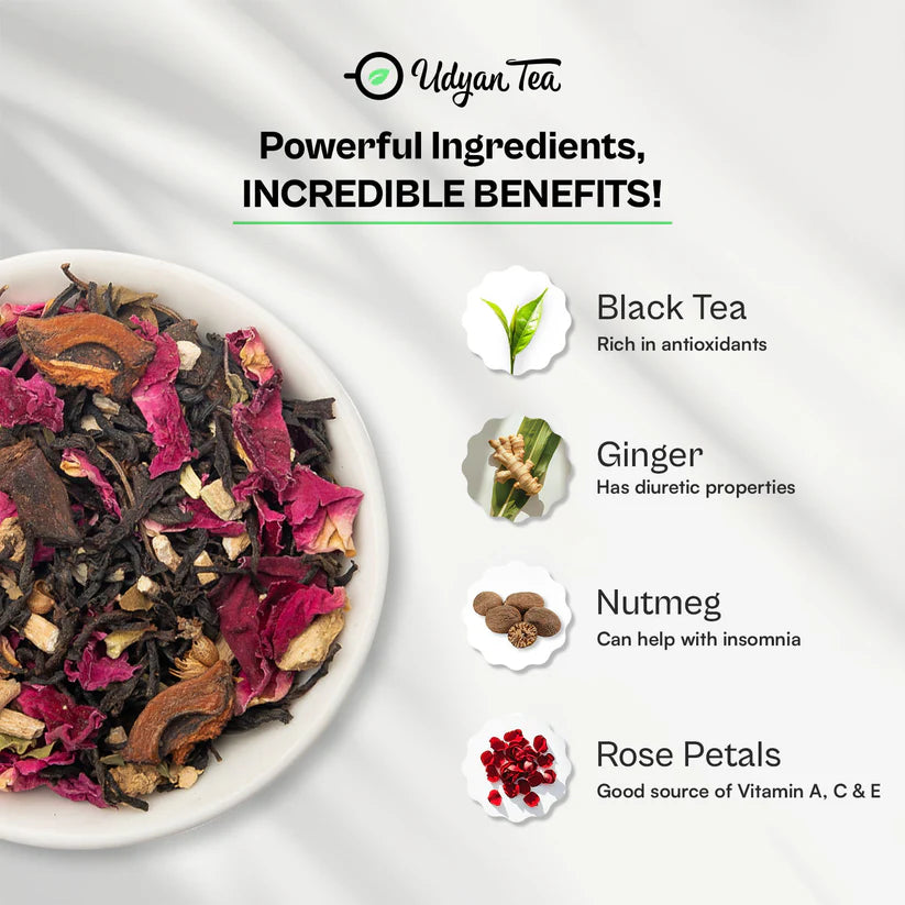 Black Tea, Ashwagandha, Rose Petals, Star Anise, Nutmeg, Tulsi, Ginger